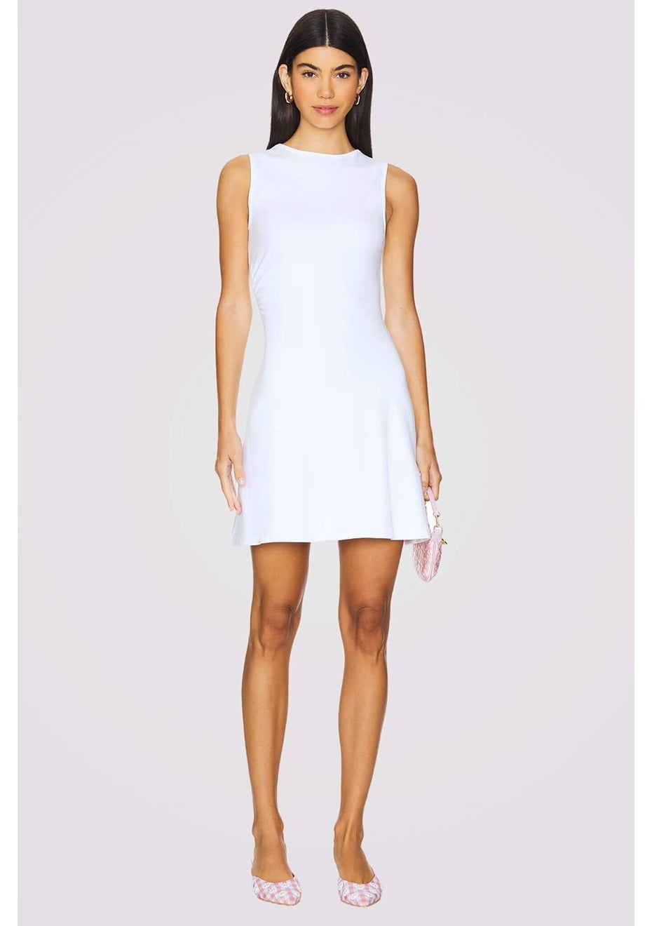 Luxe lightweight jersey Mini length dress with slight gathering at waistline High neckline with skater style skirt shape Unlined, not sheer True to size 57% RAYON 38% NYLON 5% SPANDEX- 100% COTTON